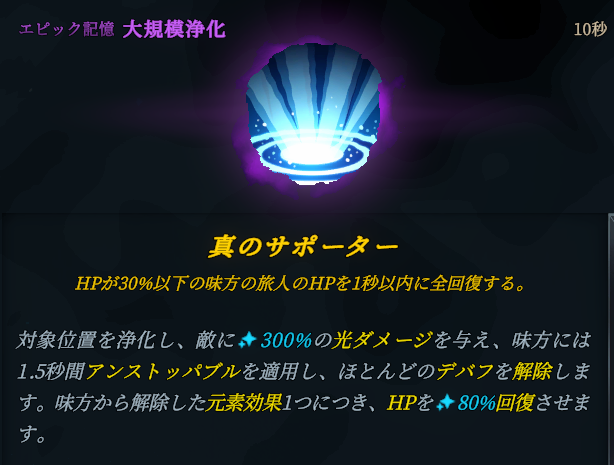 HPが30%以下の味方の旅人のHPを1秒以内に全回復する。