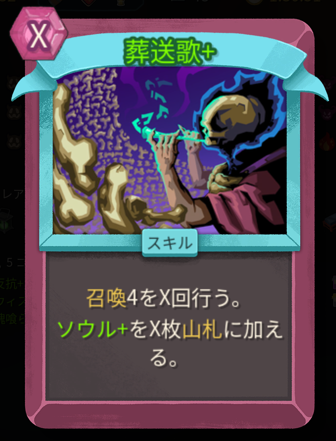 この「葬送歌」に「変貌」を付与した場合どうなるか、コストはXになります…つまりデメリット無しで再発動するようになります。